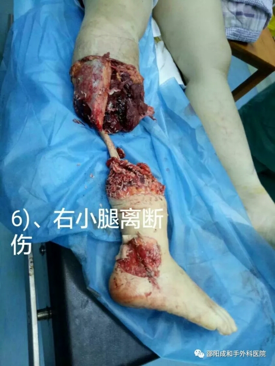 右小腿完全离断,胫腓骨粉碎骨折,骨质部分缺失。