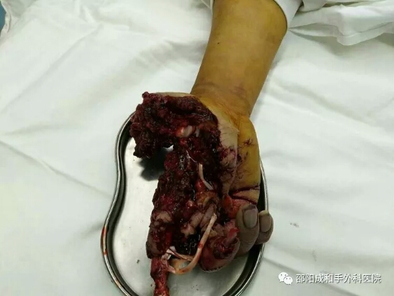 好可怜啊,右手已完全毁损,仅少许组织相连。